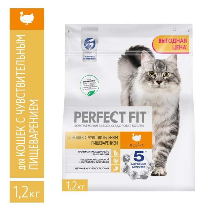 Сухой корм Perfect Fit для чувствительных кошек, индейка, 1,2 кг