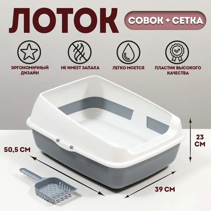 Лоток для кошек совок+ сетка 50,5 х 39 х 23 см, серый