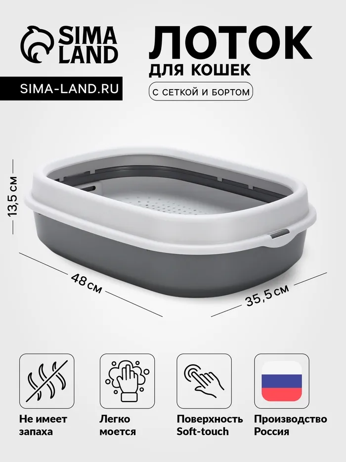 Лоток для кошек Фур-Мур 48х35,5 см с сеткой и бортом ,Soft-touch, смоки