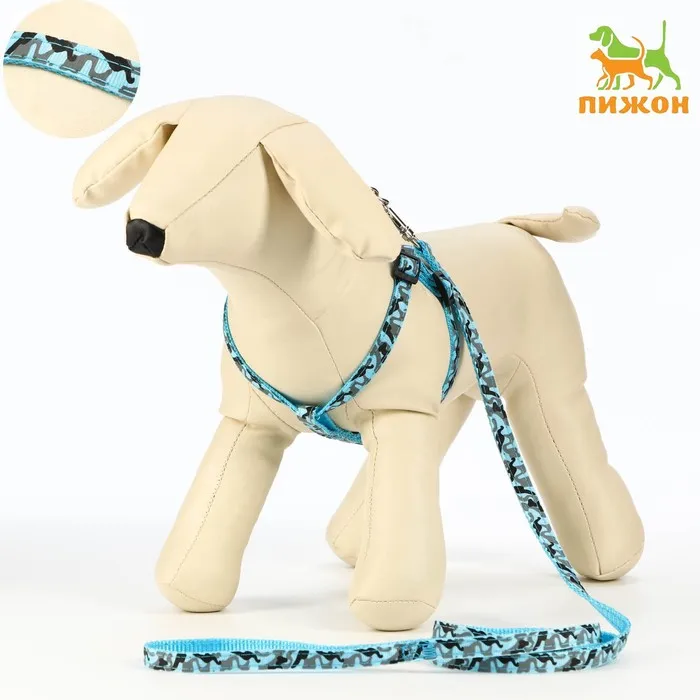 Комплект прошитый "Милитари", ширина 1 см, поводок 120 см, шлейка 23-35 см, голубой