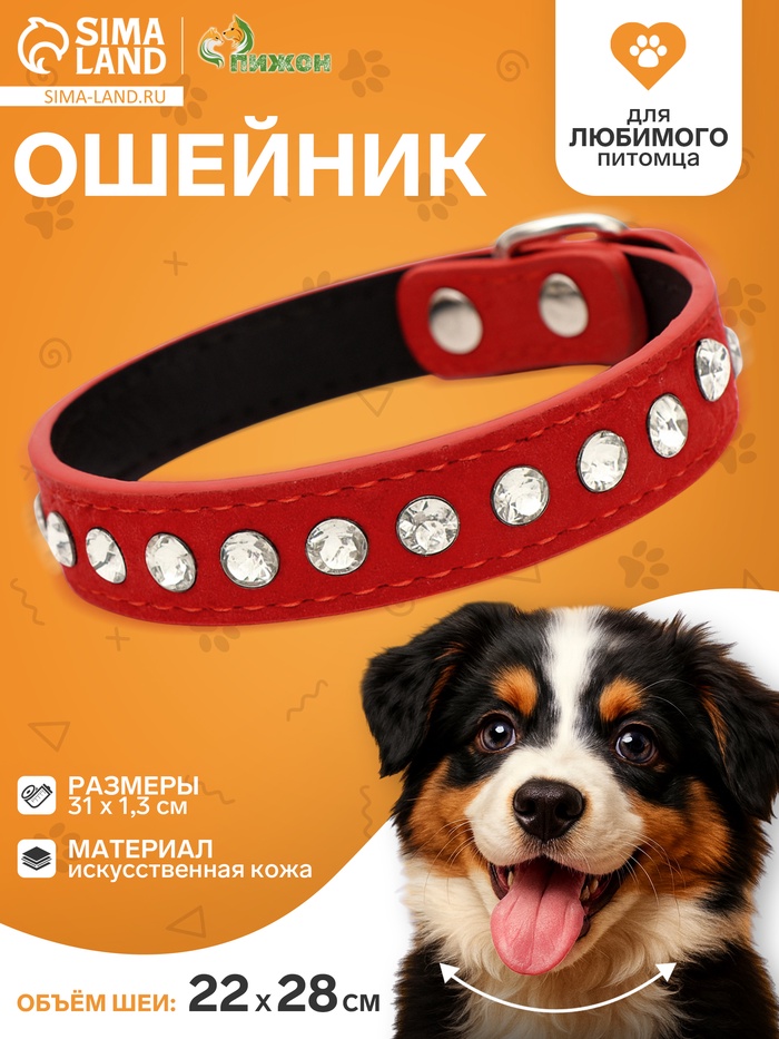 Ошейник «Бархат и стразы», 31×1.3/2 см, ОШ 22-28 см, красный