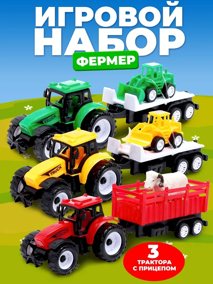 Набор инерционных тракторов «Фермер» с прицепом, 3 штуки
