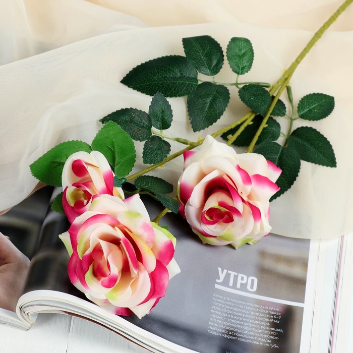 Цветы искусственные «Роза тройная», 6×61 см, бело-розовые