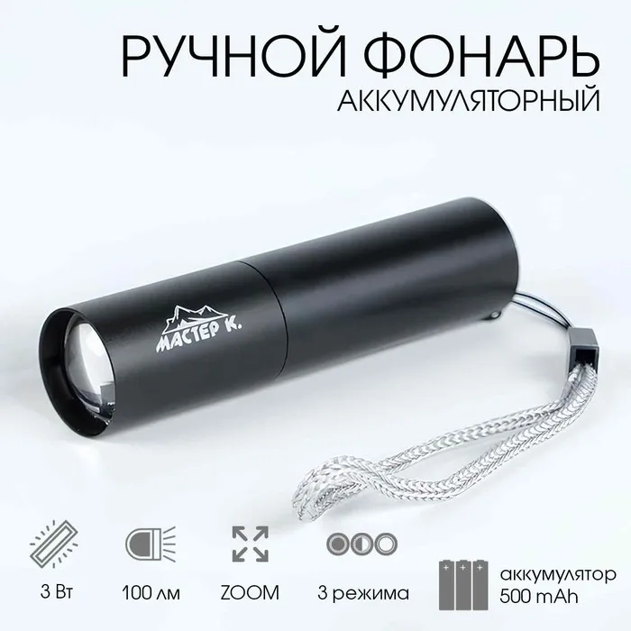 Фонарь ручной, аккумуляторный "Мастер К.", 3 Вт, 500 мАч, 100 лм, zoom, USB