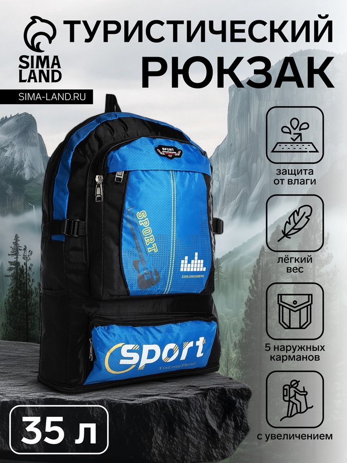 Рюкзак туристический, 35 литров, с увеличением, с карманами, Sport XLS, чёрный/синий