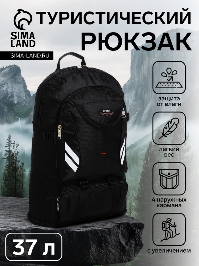 Рюкзак туристический 37 литров, с увеличением, с карманами, чёрный