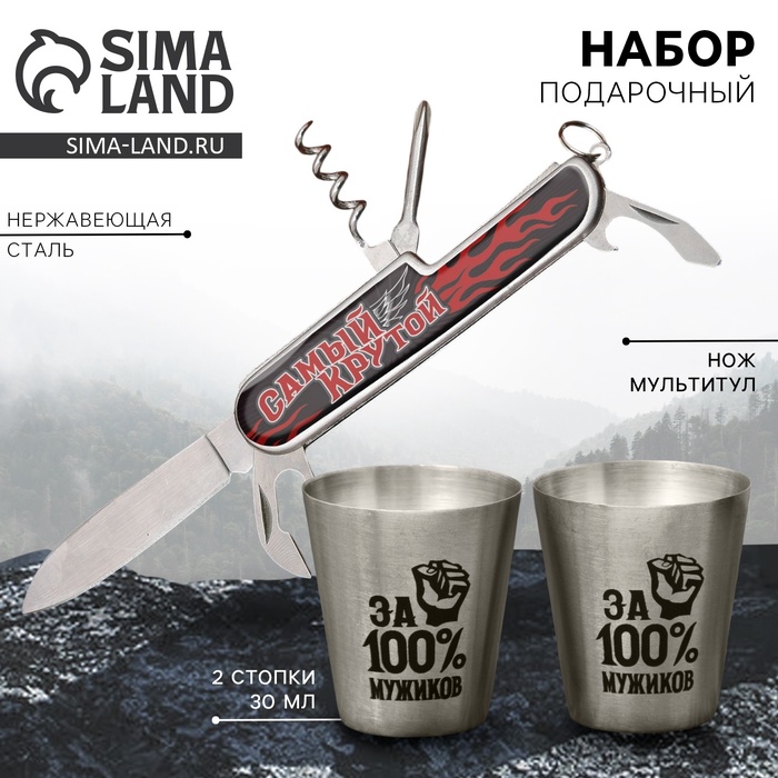 Подарочный набор мужской «Самый крутой»: нож мультитул, стопки 2 шт х 30 мл