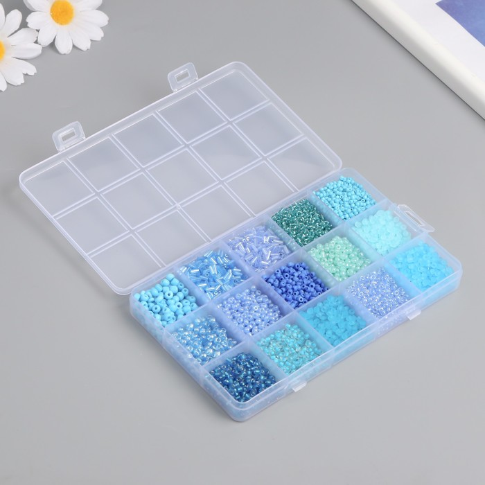 Бисер стекло 6/0, 8/0, 12/0 в шкатулке «Синий», стеклярус, 15.5×9.5×1.6 см