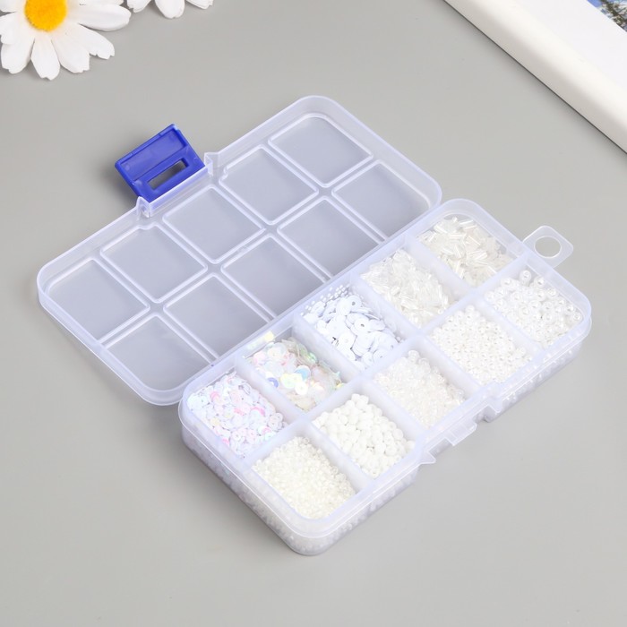 Бисер стекло 8/0, 12/0 в шкатулке «Белый», бусины, стеклярус и пайетки, 13×6.5×2.3 см