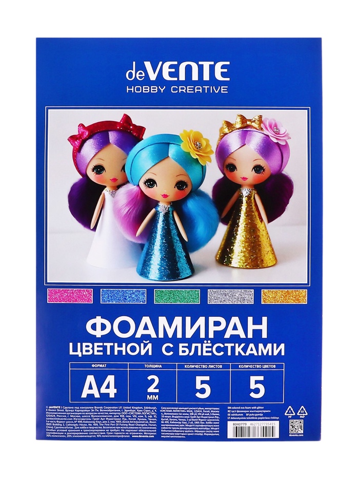 Фоамиран цветной, набор А4, 2 мм, deVENTE, 5 листов х 5 цветов, с блёстками