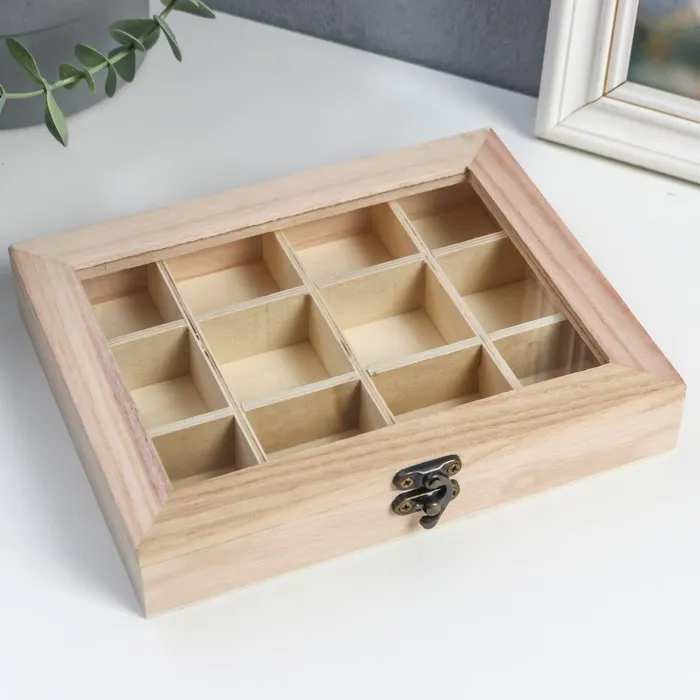 Шкатулка для росписи дерево «Прямоугольная со стеклянной вставкой», для творчества, декора, 12 отделений, 3.5×19×15 см