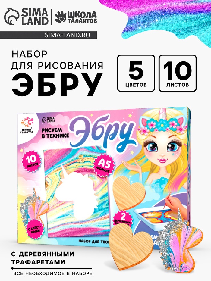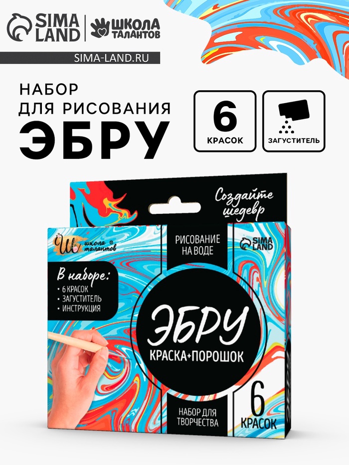 Набор для рисования эбру: краски 6 цв по 6 мл, 10 листов бумаги, загуститель 10 г, инструменты, поддон