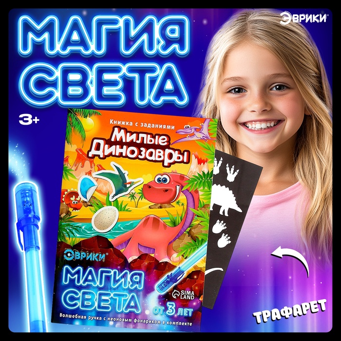 Активити-книжка с рисунками светом «Динозавры», ручка с фонариком и невидимыми чернилами