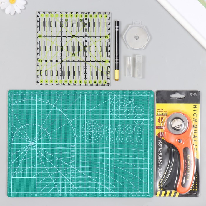 Набор для пэчворка: резиновый мат А4, линейка 15×15 см, дисковый, макетный нож+лезвия в папке
