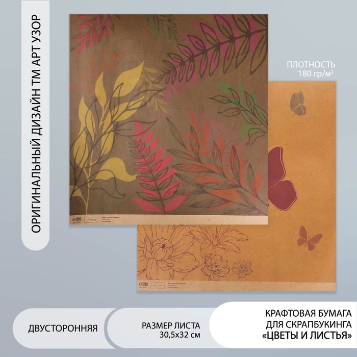 Бумага для скрапбукинга двусторонняя «Цветы и листья крафт», плотность 180 г, 30.5×32 см