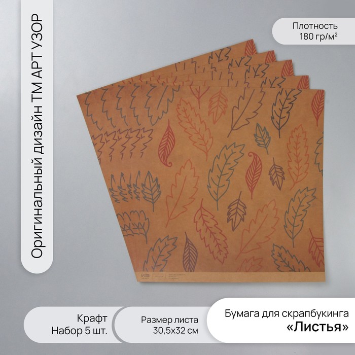 Бумага для скрапбукинга крафт «Листья», плотность 180 г, набор 5 шт., 30.5×32 см