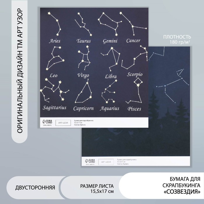 Бумага для скрапбукинга двусторонняя «Созвездия», плотность 180 г, 15.5×17 см