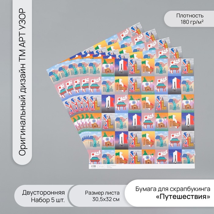 Бумага для скрапбукинга двусторонняя «Путешествия», плотность 180 г, набор 5 шт., 30.5×32 см