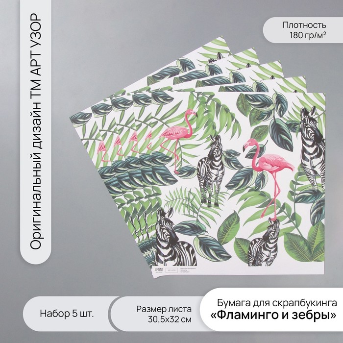 Бумага для скрапбукинга «Фламинго и зебры», плотность 180 г, набор 5 шт., 30.5×32 см