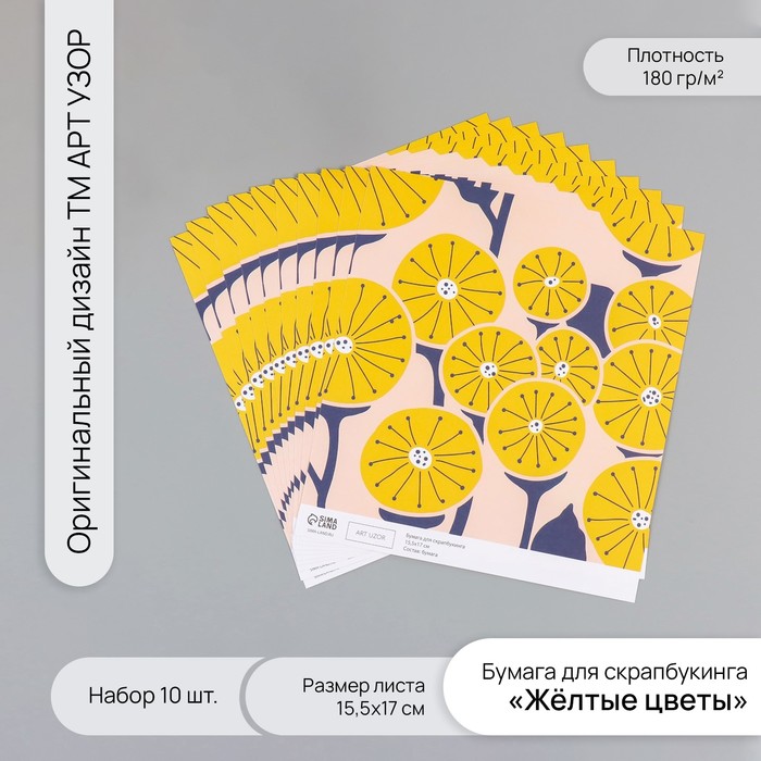 Бумага для скрапбукинга «Жёлтые цветы», плотность 180 г, набор 10 шт., 15.5×17 см
