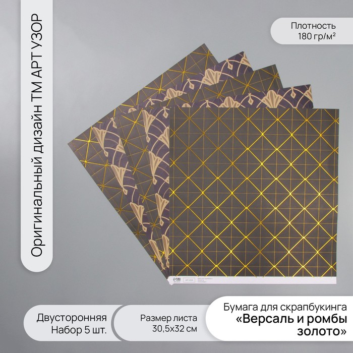 Бумага для скрапбукинга двусторонняя «Версаль и ромбы золото», плотность 180 г, набор 5 шт., 30.5×32 см