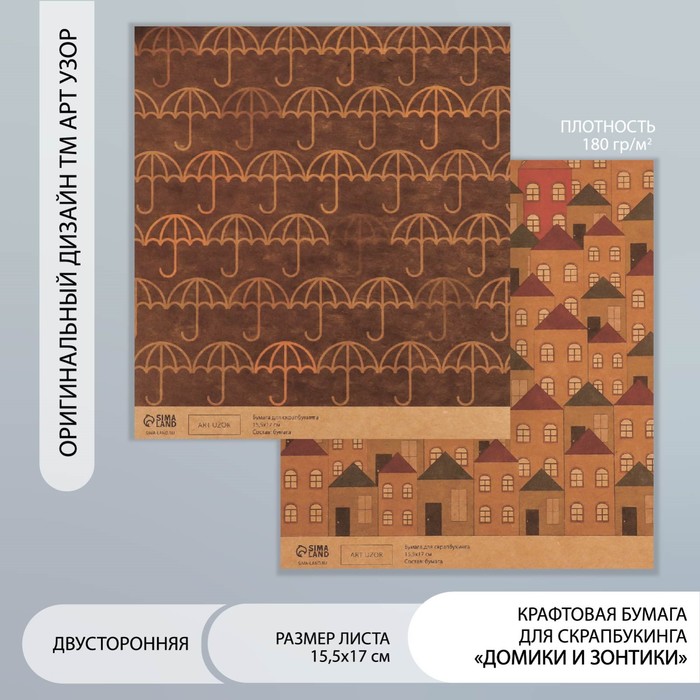 Бумага для скрапбукинга двусторонняя крафт «Домики и зонтики», плотность 180 г, 15.5×17 см
