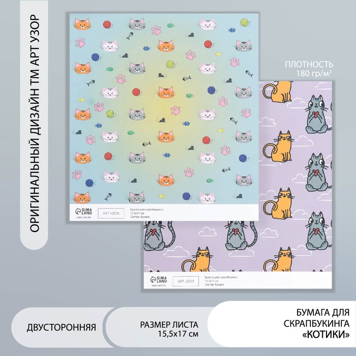 Бумага для скрапбукинга двусторонняя «Котики», плотность 180 г, 15.5×17 см
