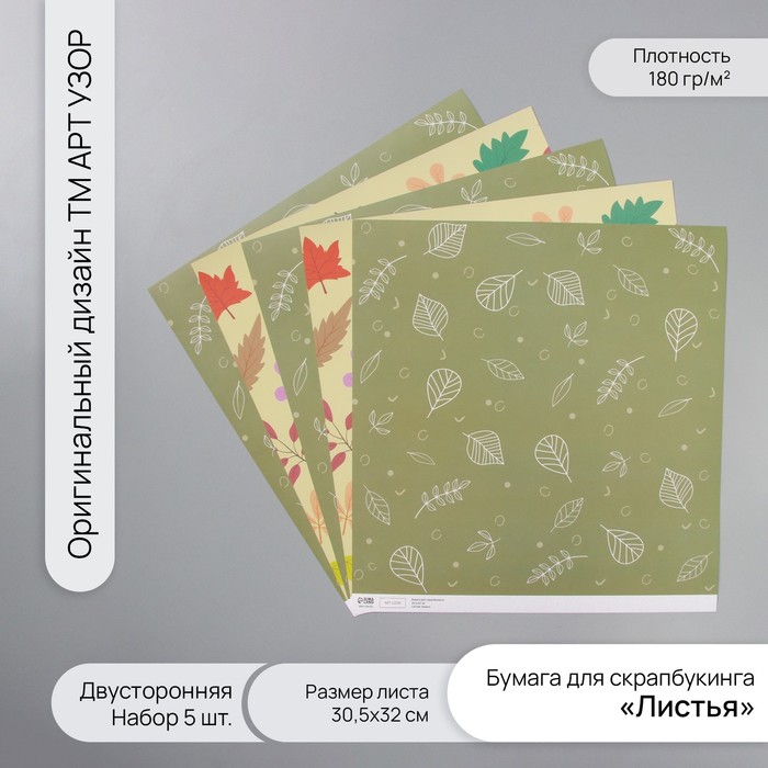 Бумага для скрапбукинга двусторонняя «Листья», плотность 180 г, набор 5 шт., 30.5×32 см