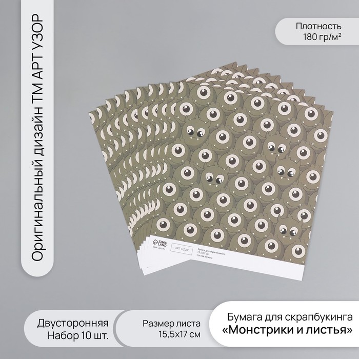Бумага для скрапбукинга двусторонняя «Монстрики и листья», плотность 180 г, набор 10 шт., 15.5×17 см