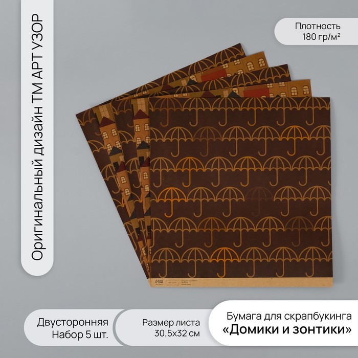 Бумага для скрапбукинга двусторонняя крафт «Домики и зонтики», плотность 180 г, набор 5 шт., 30.5×32 см