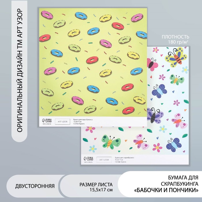 Бумага для скрапбукинга двусторонняя «Бабочки и пончики», плотность 180 г, 15.5×17 см