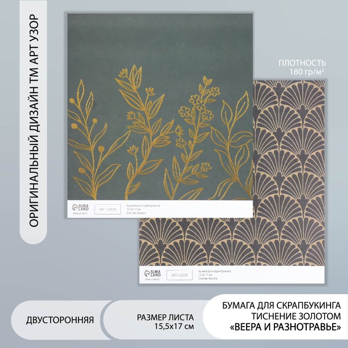 Бумага для скрапбукинга двусторонняя «Веера и разнотравье золото», плотность 180 г, 15.5×17 см