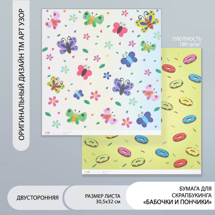 Бумага для скрапбукинга двусторонняя «Бабочки и пончики», плотность 180 г, 30.5×32 см
