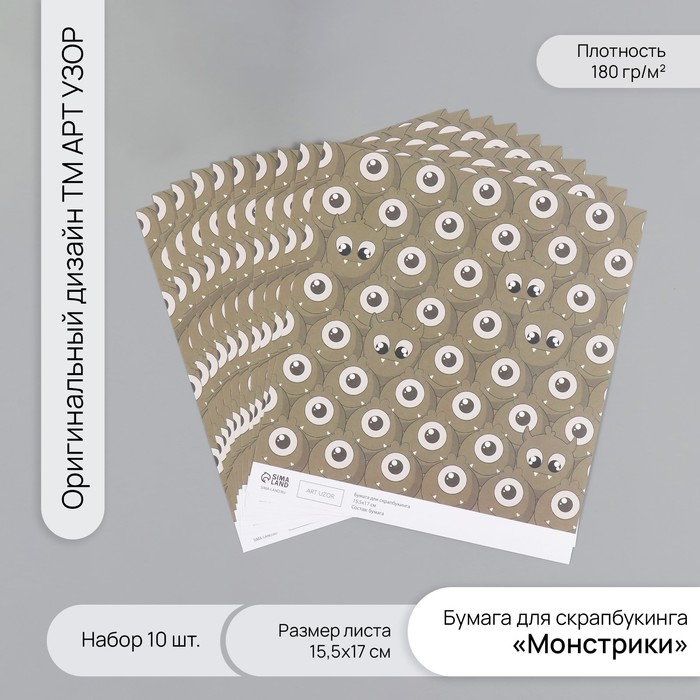 Бумага для скрапбукинга «Монстрики», плотность 180 г, набор 10 шт., 15.5×17 см