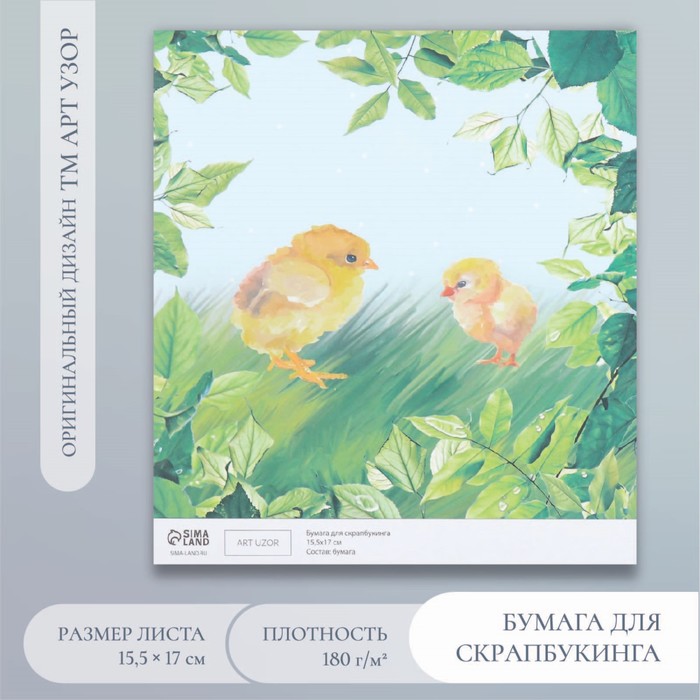 Бумага для скрапбукинга "Цыплята на траве" плотность 180 гр 15,5х17 см