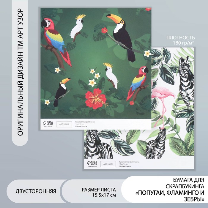 Бумага для скрапбукинга двусторонняя «Попугаи, фламинго и зебры», плотность 180 г, 15.5×17 см