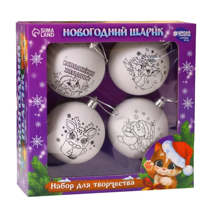 Ёлочные шары под раскраску на новый год «Чудесный подарок», 4 шт, d=7см, набор для творчества