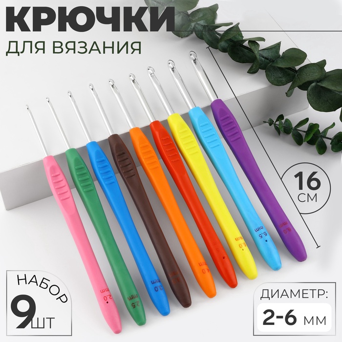 Набор крючков для вязания, d=2-6 мм, 16 см, 9 шт., разноцветный
