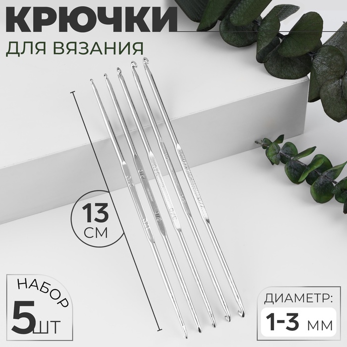 Набор крючков для вязания, d=1-3 мм, 13 см, 5 шт.