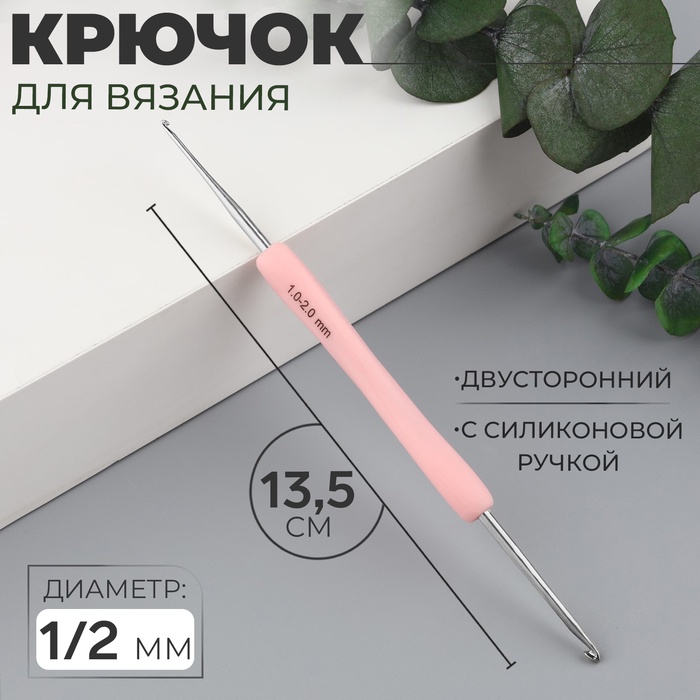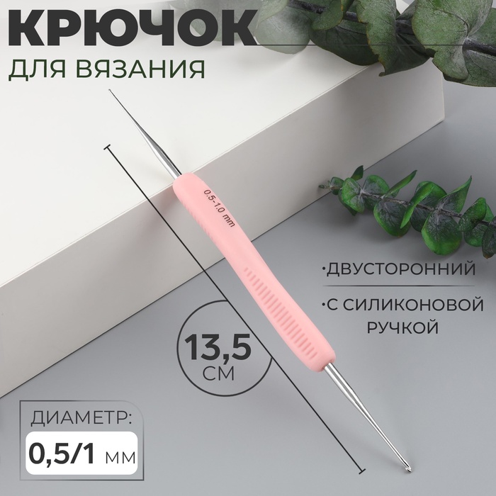 Крючок для вязания, двусторонний, с силиконовой ручкой, d=0.5/1 мм, 13.5 см, розовый