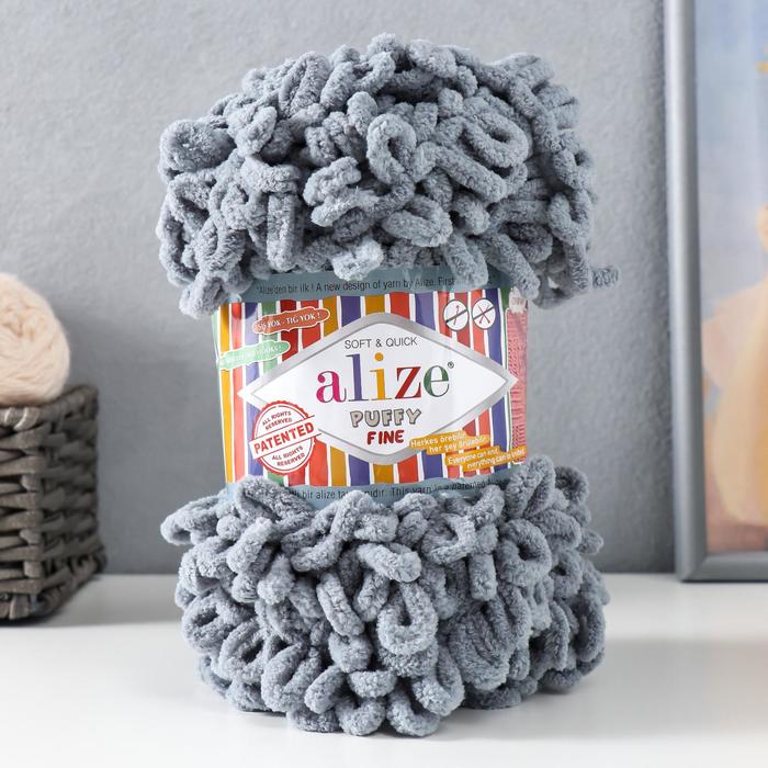 Плюшевая пряжа для вязания руками ALIZE, Puffy fine, 100% микрополиэстер, 14.5 м/100 г, (343 серый)