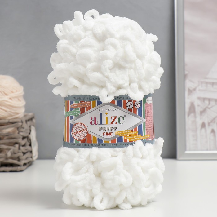 Плюшевая пряжа для вязания руками ALIZE, Puffy fine, 100% микрополиэстер, 14.5 м/100 г, (55 белый)