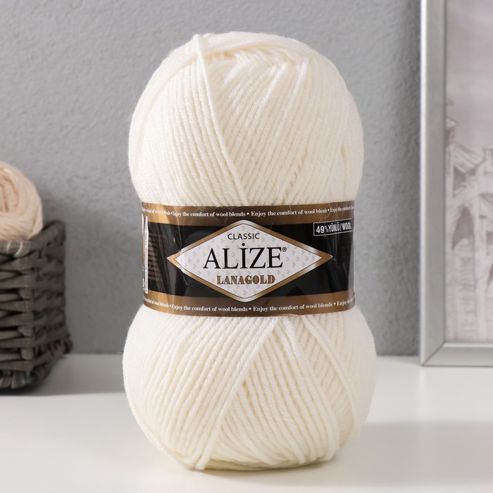 Пряжа для вязания спицами, крючком ALIZE, Lanagold fine, 49% шерсть, 51% акрил, 390 м/100 г, (01 кремовый)