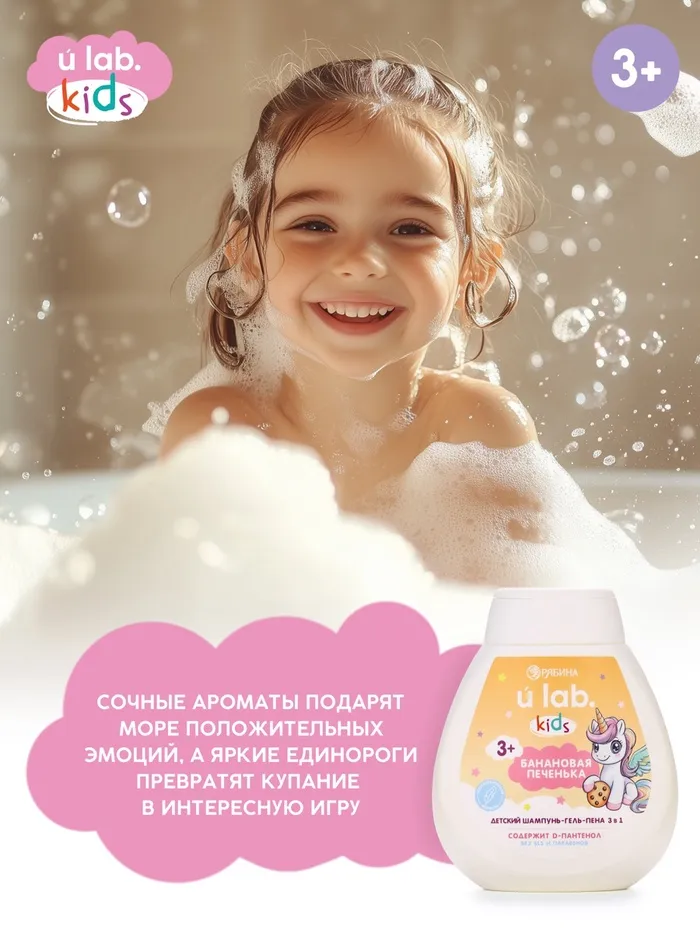 Пенка для купания 2в1 детская LULU с пантенолом, без парабенов, без силиконов, 250 мл