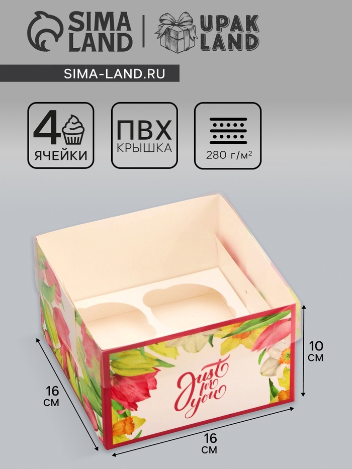 Коробка для 4 капкейка с прозрачной крышкой, «Тюльпаны», 16×16×10 см