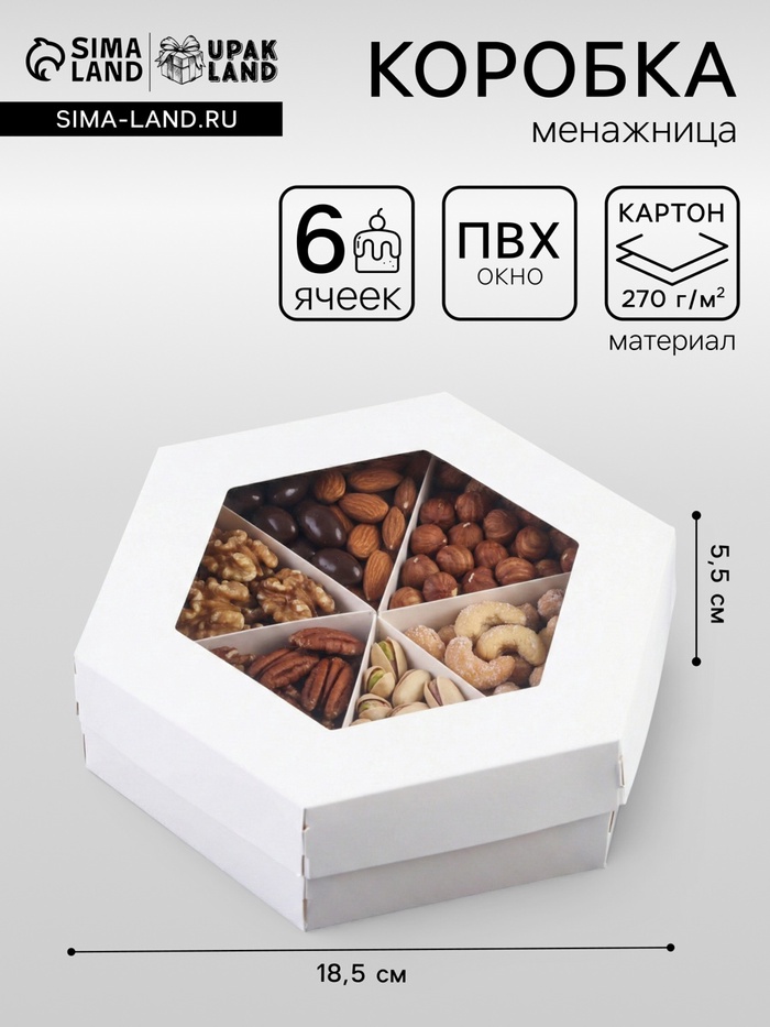 Коробка - менажница белая, с окном, 6 ячеек, 18.5×18.5×5.5 см