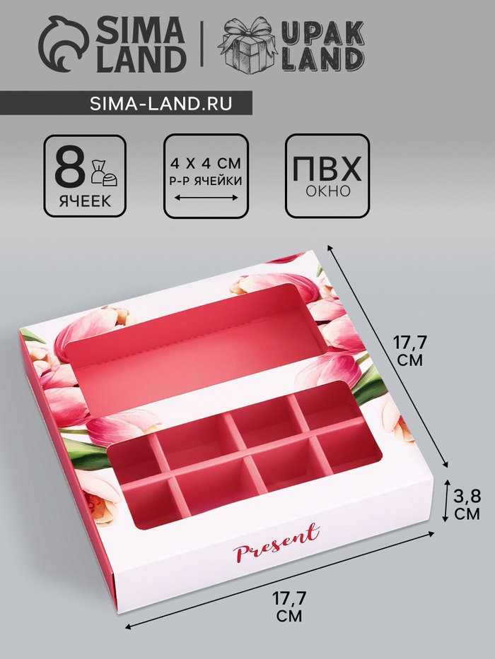 Коробка для 8 конфет + шоколад, с окном «Презент», 17.7×17.8×3.8 см Кондитерская упаковка