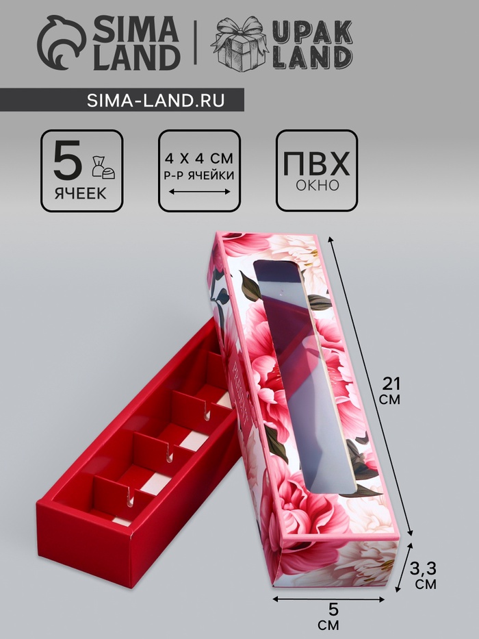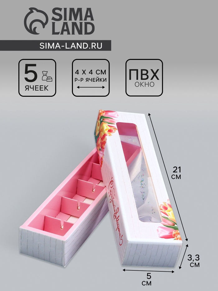Коробка для 5 конфет с обечайкой, с окном «8 марта», 21×5×3.3 см