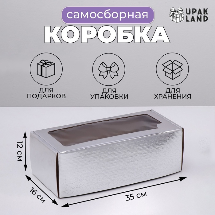 Коробка самосборная, с окном, серебряная, 16×35×12 см