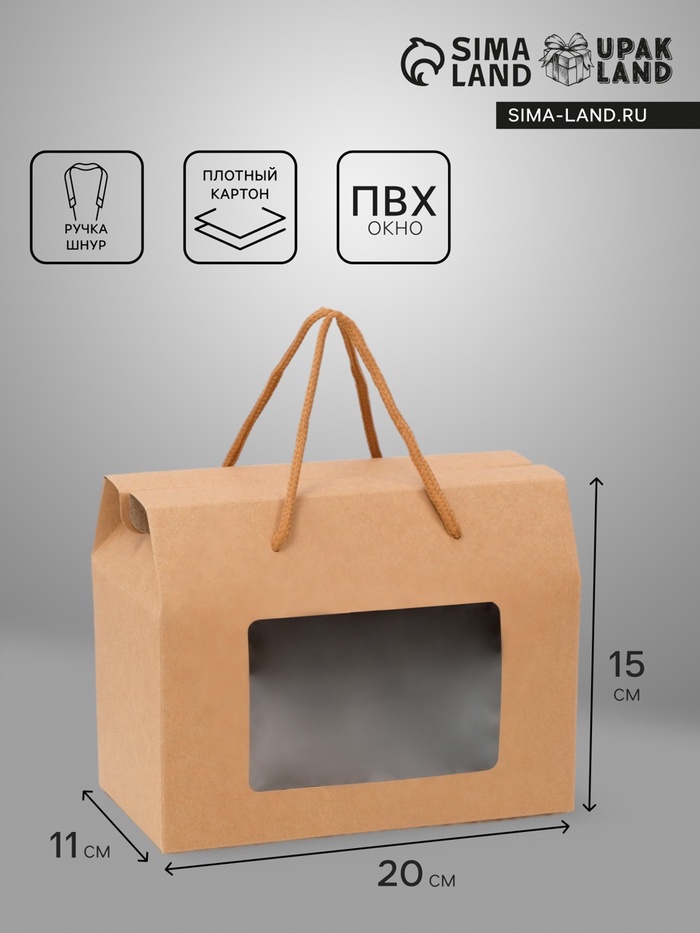 Коробка - пакет, с окном и ручками, крафтовая, 20×15×11 см
